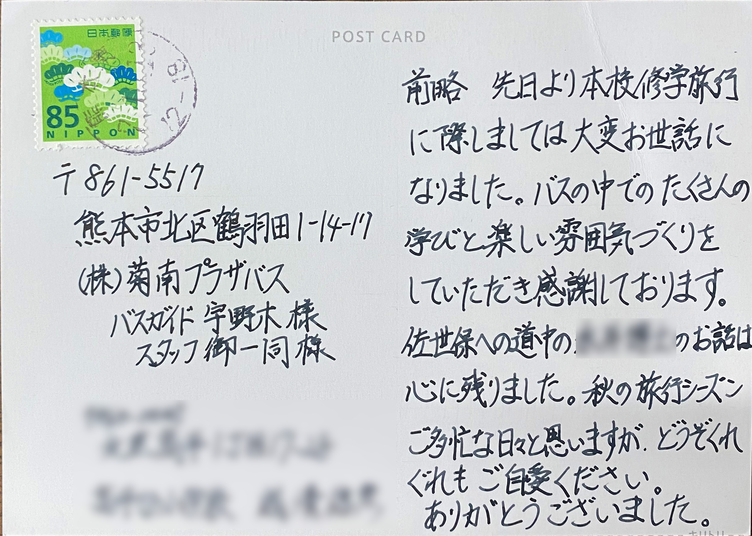 前略 先日より本校修学旅行に際しましては大変お世話になりました。バスの中でのたくさんの学びと楽しい雰囲気づくりをしていただき感謝しております。佐世保への道中の****のお話は心に残りました。秋の旅行シーズンご多忙な日々かと思いますが、どうぞくれぐれもご自愛ください。