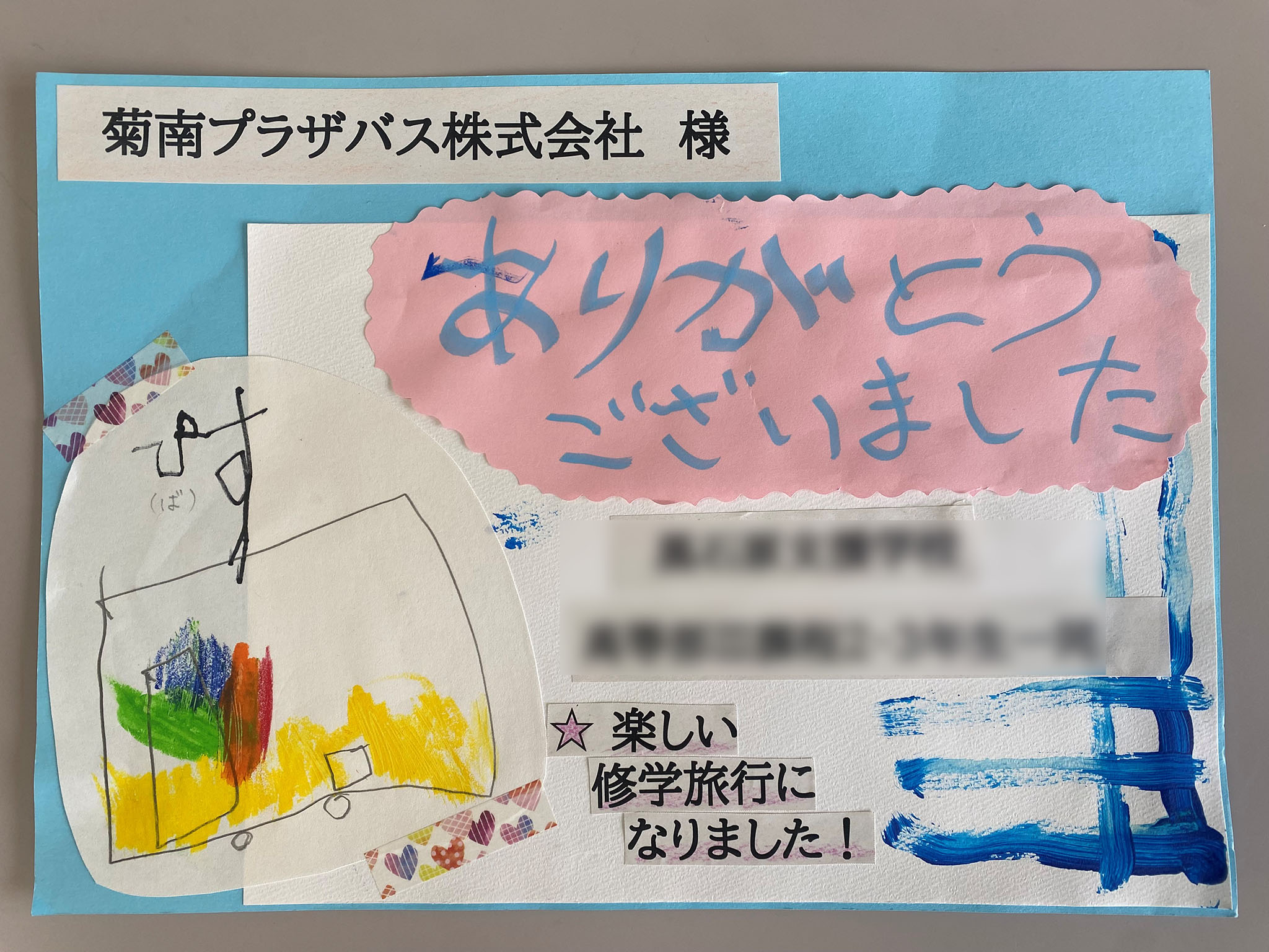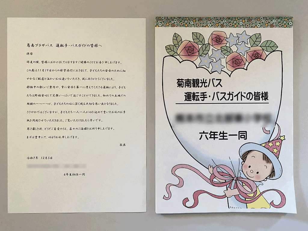 先日の修学旅行では、楽しく安全に子どもたちをつれて行って下さり、ありがとうございました。おかげ様で子どもたちにとって、思い出に残る旅行となりました。子ども達が、感謝の気もちを伝えたくお手紙を書きましたのでよんでいただけるとありがたいです。