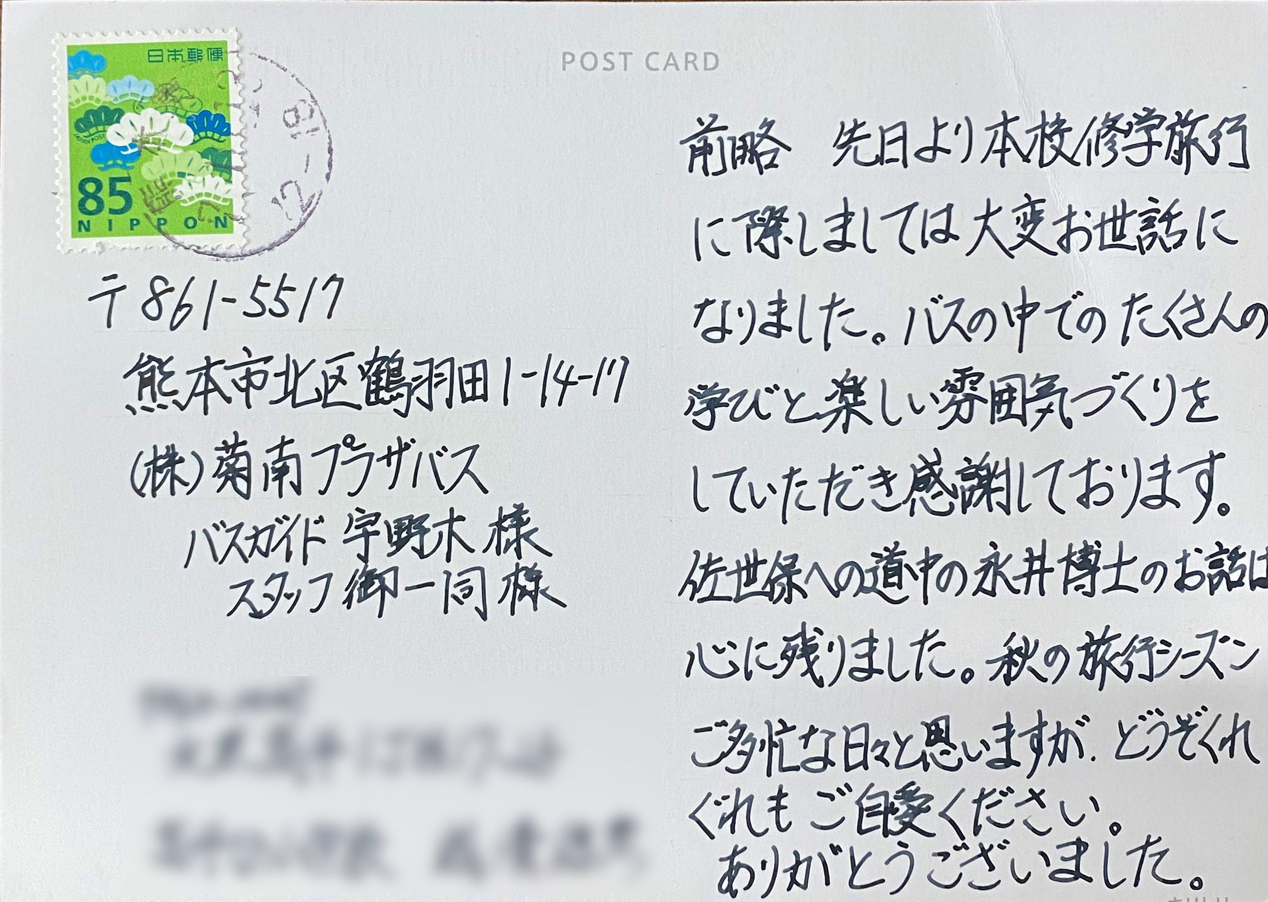 前略 先日より本校修学旅行に際しましては大変お世話になりました。バスの中でのたくさんの学びと楽しい雰囲気づくりをしていただき感謝しております。佐世保への道中の永井博士のお話は心に残りました。秋の旅行シーズンご多忙な日々かと思いますが、どうぞくれぐれもご自愛ください。