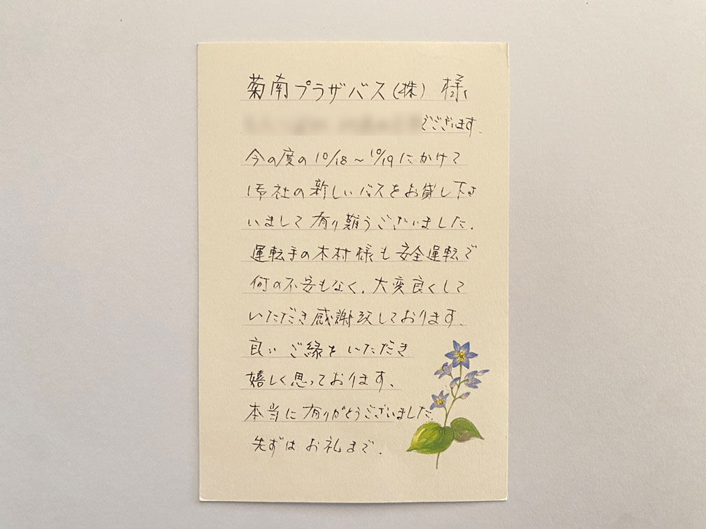 〇〇〇〇でございます。今の度の10/18~10/19にかけて御社の新しいバスをお貸し下さいまして有り難うございました。